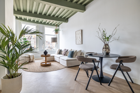 1e verdieping: heerlijk ruime en lichte woonkamer en woonkeuken. De woonkamer heeft 3 grote ramen aan de voorzijde en biedt zicht op historische panden en links op de gracht en bomen. In de woonkeuken is een kookeiland aangebracht, dat is voorzien van een kookeiland (wit hoogglans) met bar, Bora inductie kookplaat met geïntegreerde recirculatiekap, veel laden en een rvs spoelbak. Wand waarin zich de vaatwasser, combi-oven, grote koel-/vriescombinatie en bergruimte bevinden. Deze wand is "afsluitbaar" middels licht eiken panelen. Eethoek met grote ramen en openslaande deuren naar de daktuin.